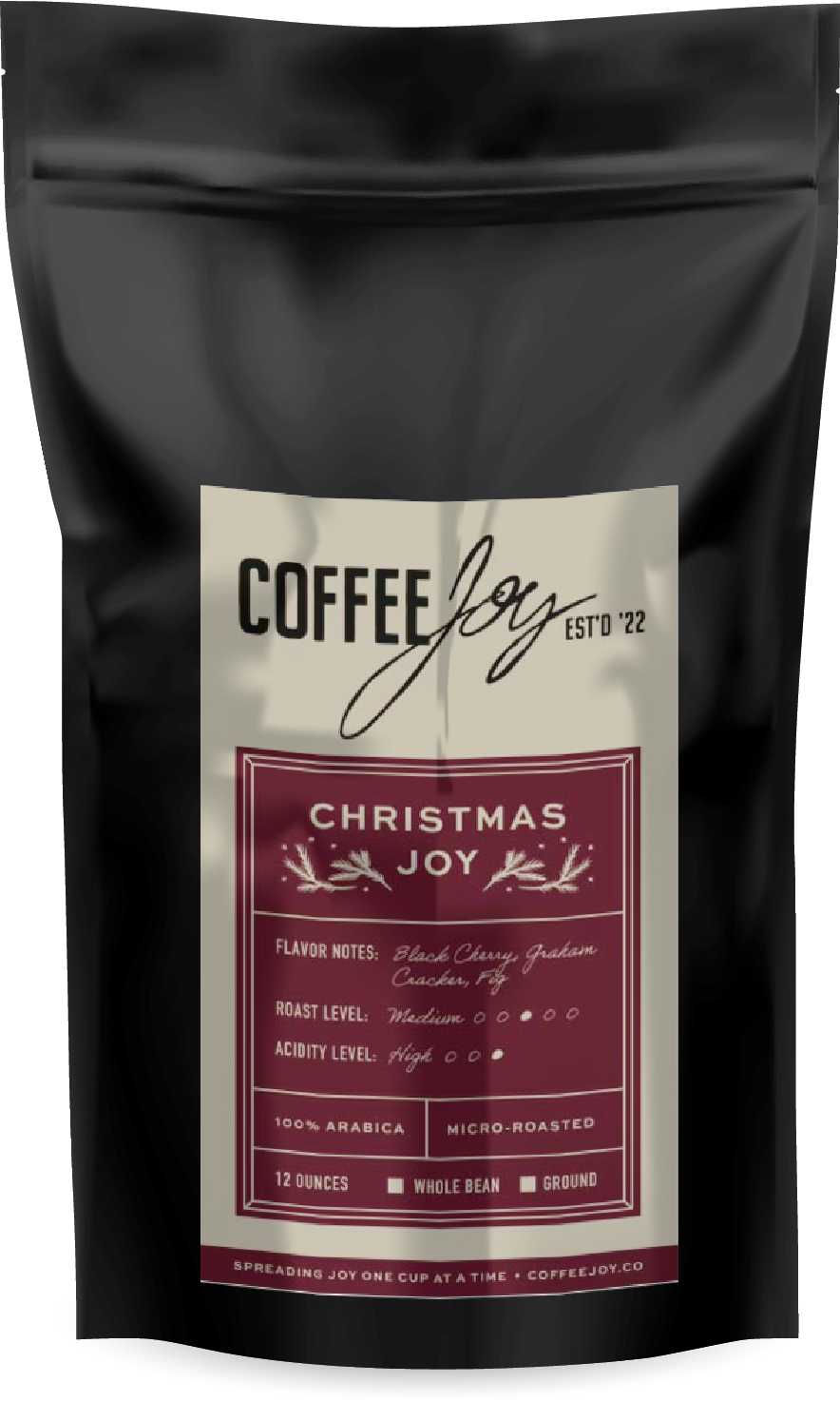Our Christmas Joy is a medium roast, with hints of black cherry, graham cracker, and fig. Choose from Whole Bean and Ground 12 oz bags.